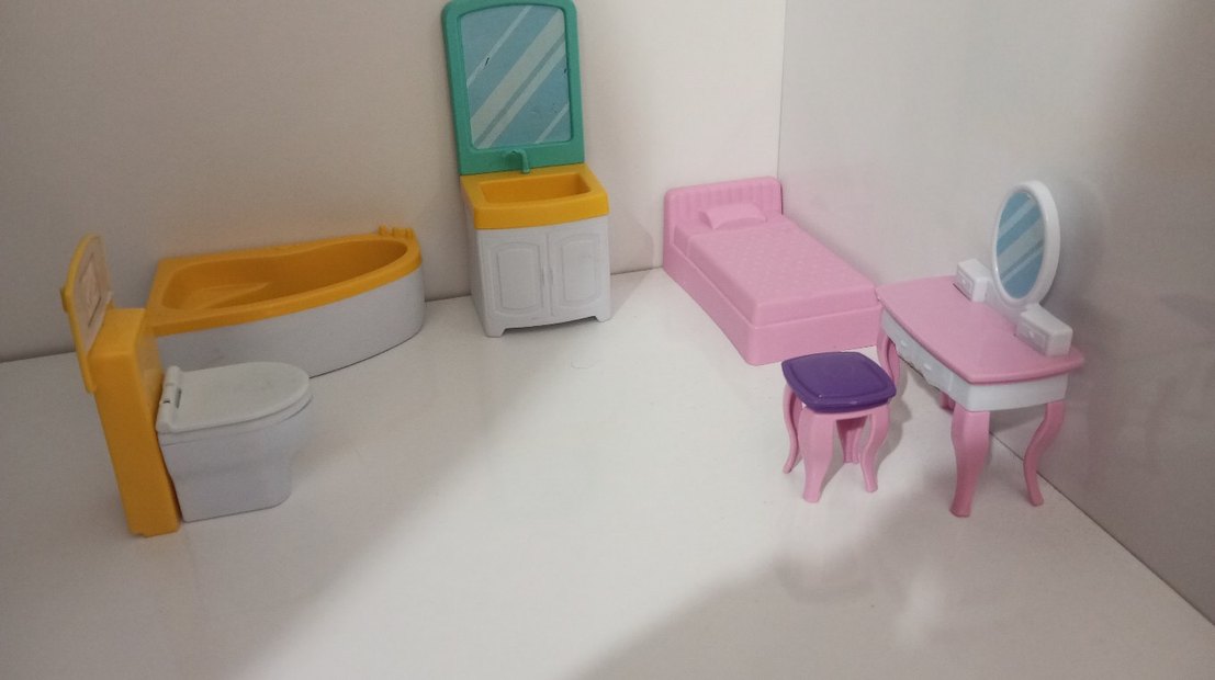 Pembe yatak, ayna ve lavabolu sarı-yeşil makyaj masası ile mor tabureden oluşan pastel renkli oyuncak mobilya seti. ️