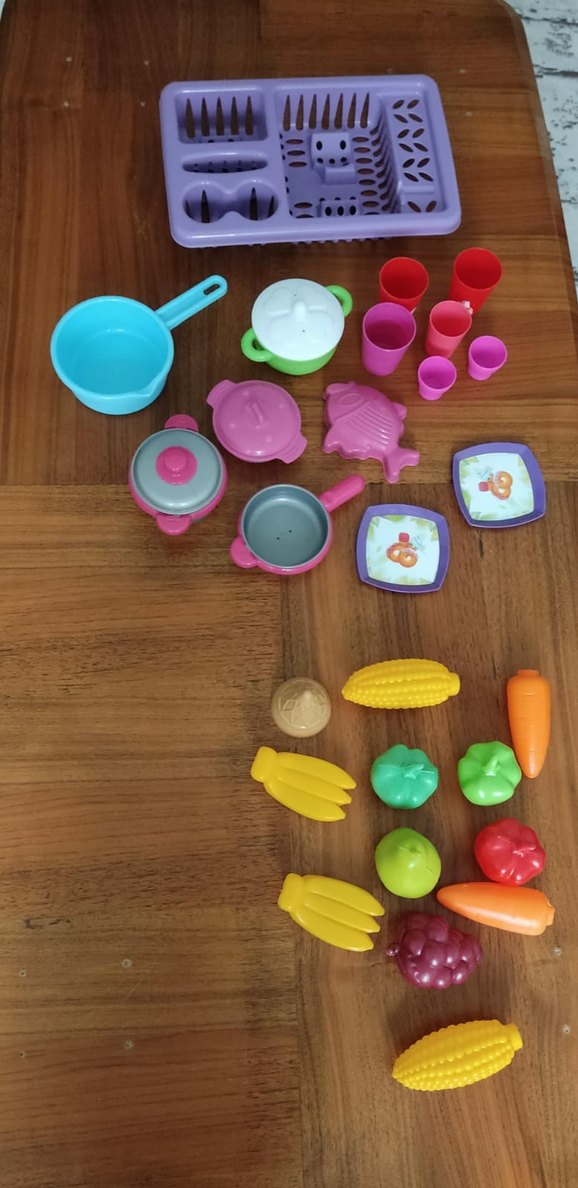 Pastel renklerde oyuncak mutfak seti; tencere, tava, bardak, tabak ve çeşitli plastik meyve sebzeler içerir.