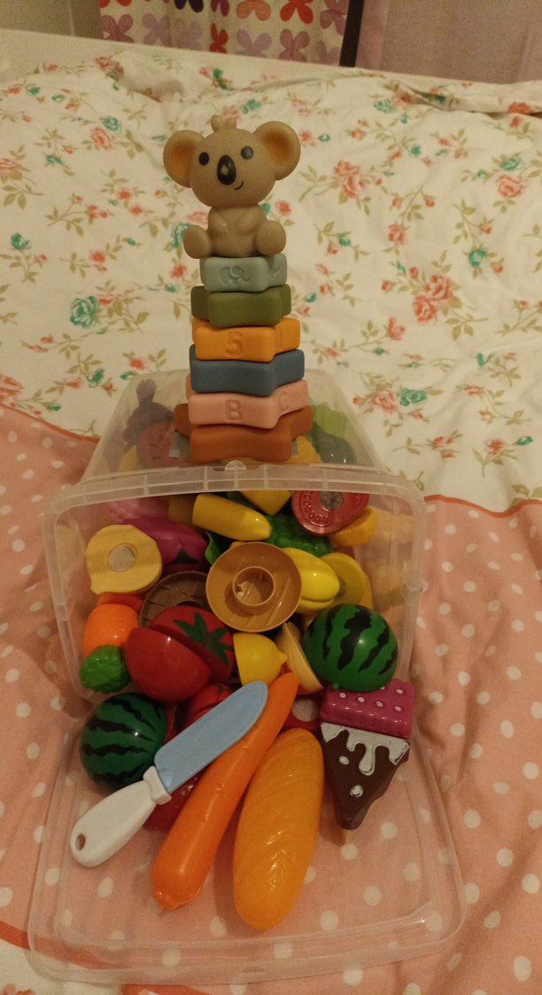Üstünde koala figürü olan pastel renkli bloklar ve çeşitli renkli plastik meyve, sebzeler ile oyuncak bıçak içerir.