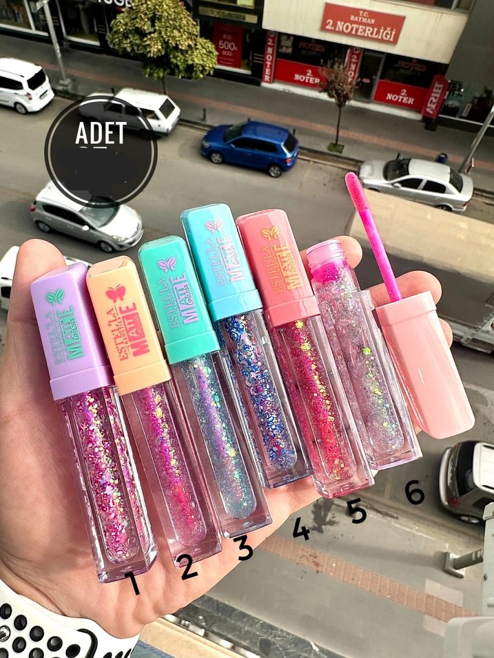 Altı adet pastel renkli, ışıltılı likit dudak parlatıcısı seti. Her biri farklı pastel kapaklı ve çok renkli simler içerir. ✨