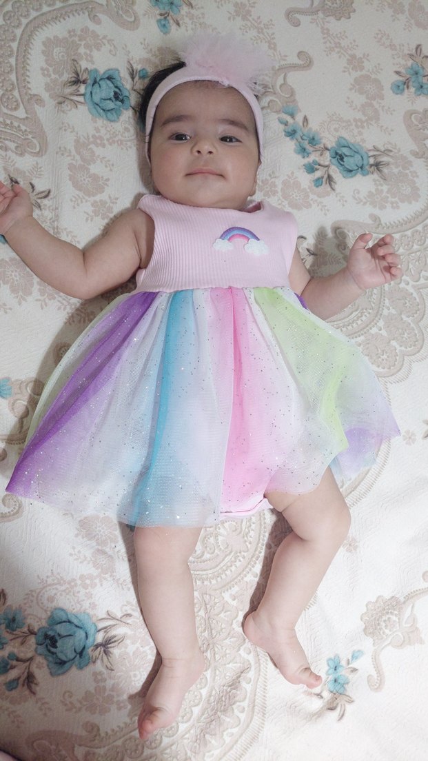 Pastel renkli çok renkli batik desenli, parlak tüllü, kolsuz, göğsünde gökkuşağı işlemeli bebek elbisesi.