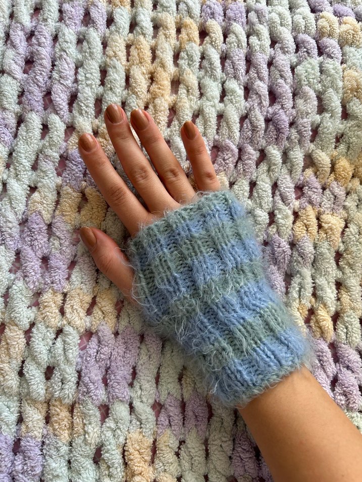 Yumuşak örgüden yapılmış, pastel renkli kadın eldiveni. Rahat ve retro bohem tarzıyla sıcak tutar.