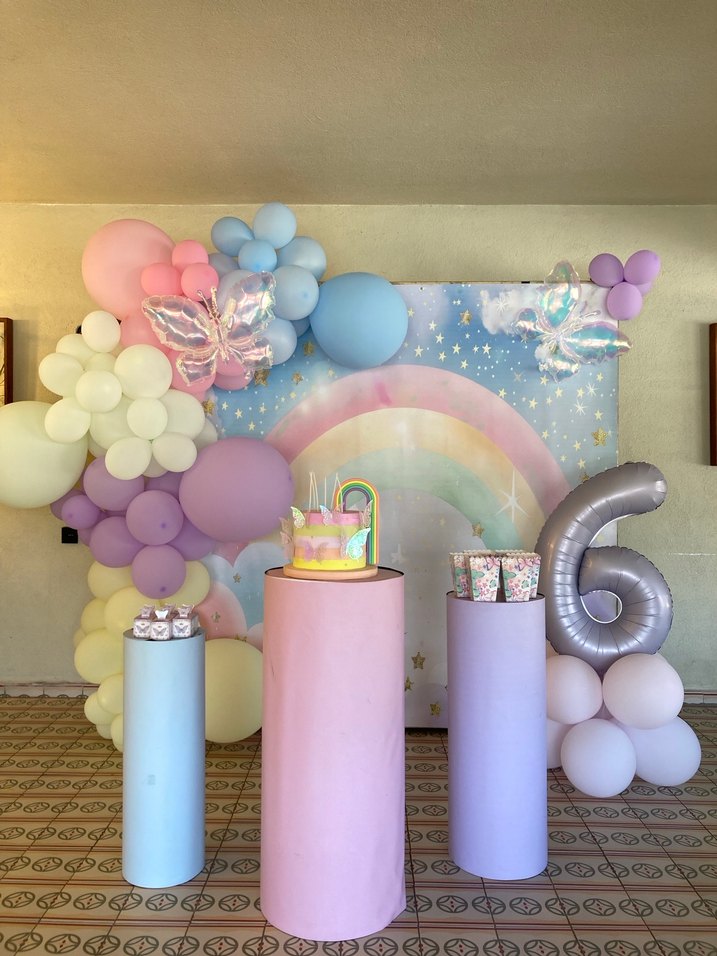 Pastel tonlarda balonlar ve gökkuşağı temalı dekor kelebek gökkuşağı üniforma ile uyumlu parti malzemeleri. Detaylar diğer postta
