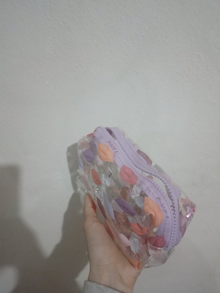 Pastel renklerde, baskılı ve payet detaylı plastik kadın makyaj çantası. Fermuarlı ve minimalist, modaya uygun tarzda. ✨