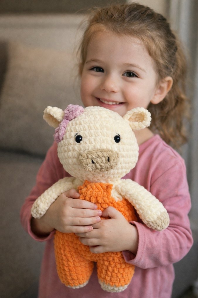 Amigurumi inek Camel tonlarında, dokulu kumaştan yapılmış yumuşak pastel renkli peluş oyuncak. Sarılmak ve oynamak için uygundur.