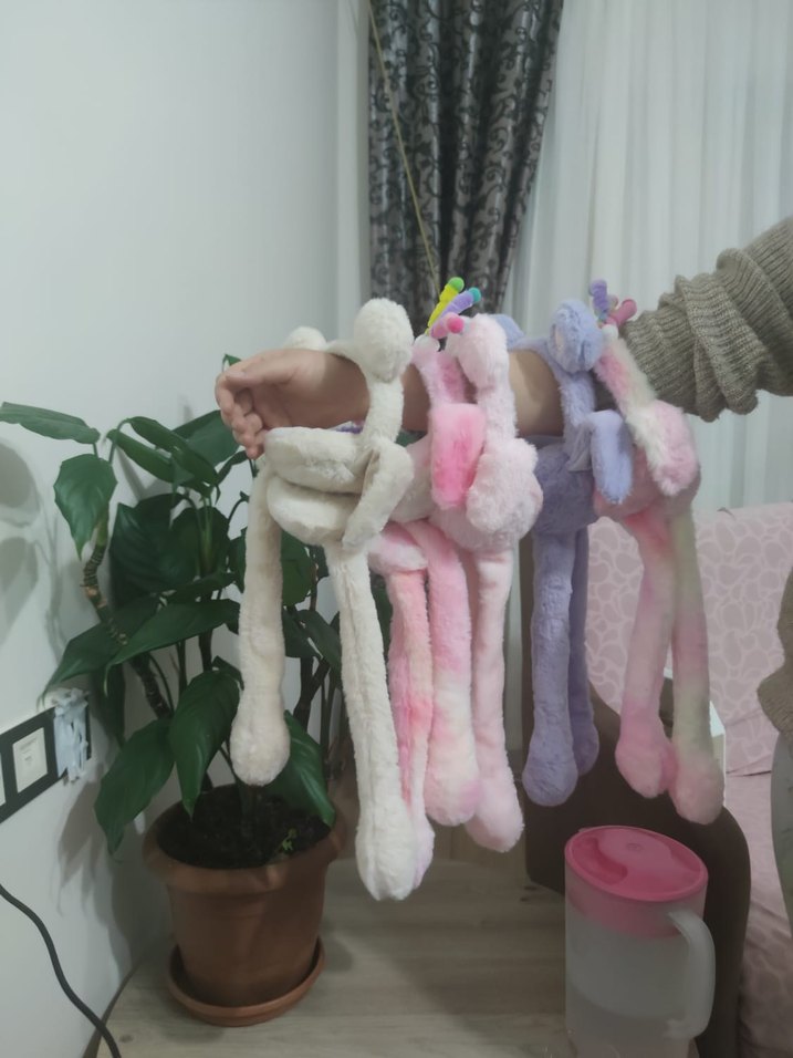 Yumuşak pastel tonlarda, uzun kolları ve sevimli detayları olan çok renkli peluş oyuncaklar. peluş kulaklık