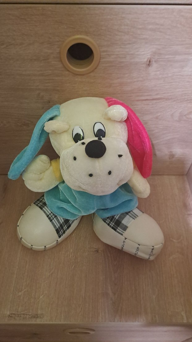 Yumuşak pastel renkli peluş oyuncak köpek, renkli kulaklar ve kareli ayakkabı detaylarına sahip. (goz üst kısım boyasi silinmis)