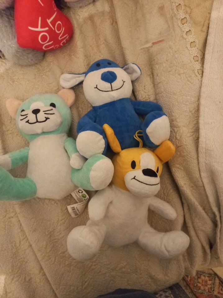 Farklı hayvan figürlerinde, yumuşak dokulu ve gülümseyen yüzlü üç pastel renkli peluş oyuncak seti. hepsi yeni hediye olarak hergun bitane alıyordum