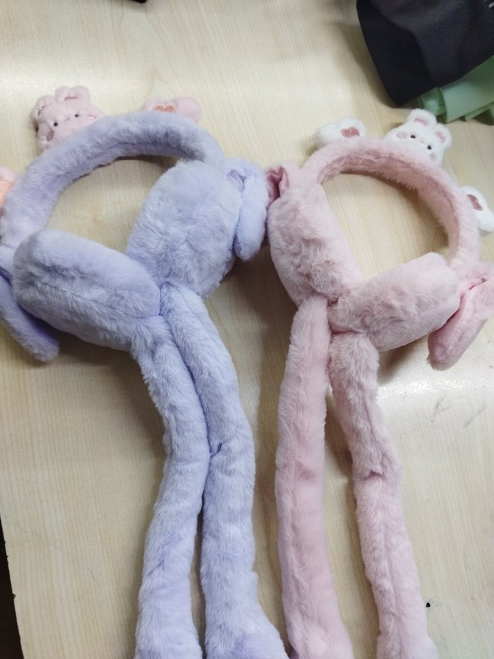 Pastel pembe ve mor renklerde, uzun tavşan kulakları ve sevimli tavşan yüzü detaylı yumuşak peluş kulaklıklar.