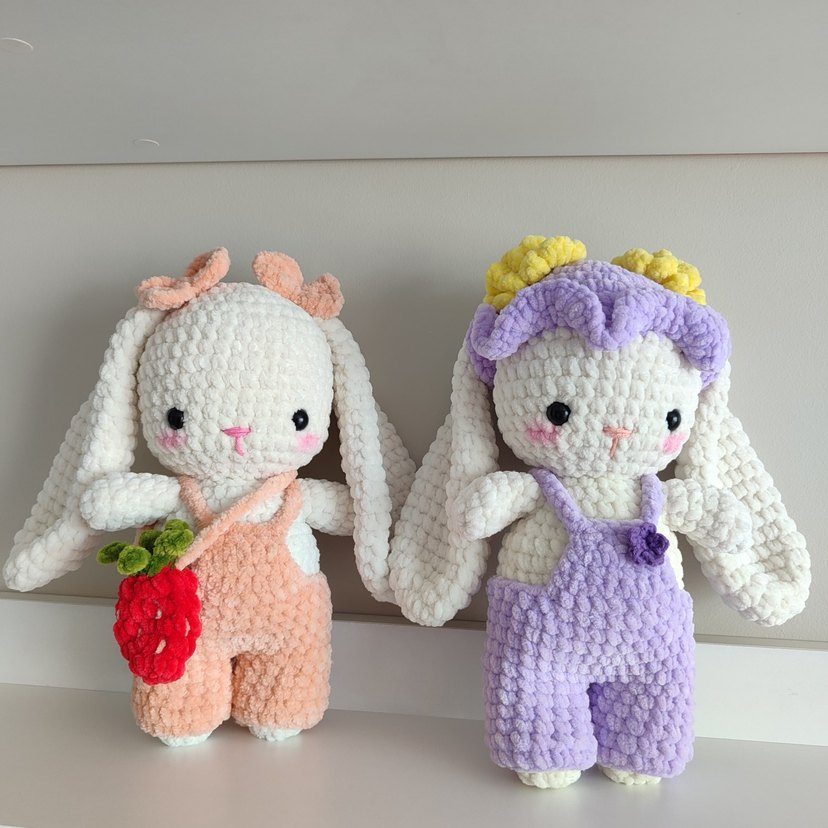 Pastel renklerde, uzun kulaklı, tulum giymiş yumuşak peluş tavşan oyuncaklar. Birinin elinde kırmızı çilek var. Sarılmak için ideal.
