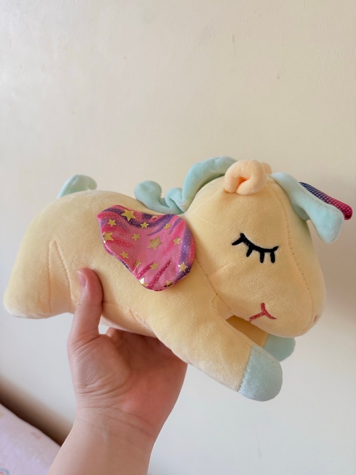 Yumuşak kumaştan yapılmış, işlemeli detaylara sahip pastel renkli peluş unicorn oyuncak.