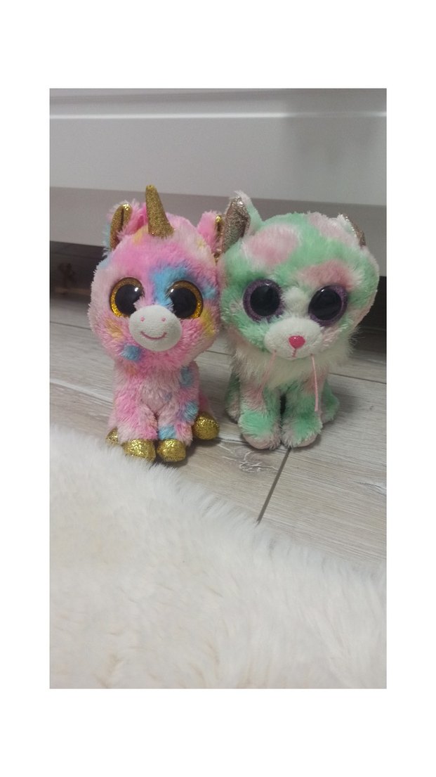 Altın detaylı unicorn ve yeşil benekli kedi olmak üzere iki pastel renkli peluş oyuncak, büyük yuvarlak gözlere sahip. ty armağan peluş 2 adet