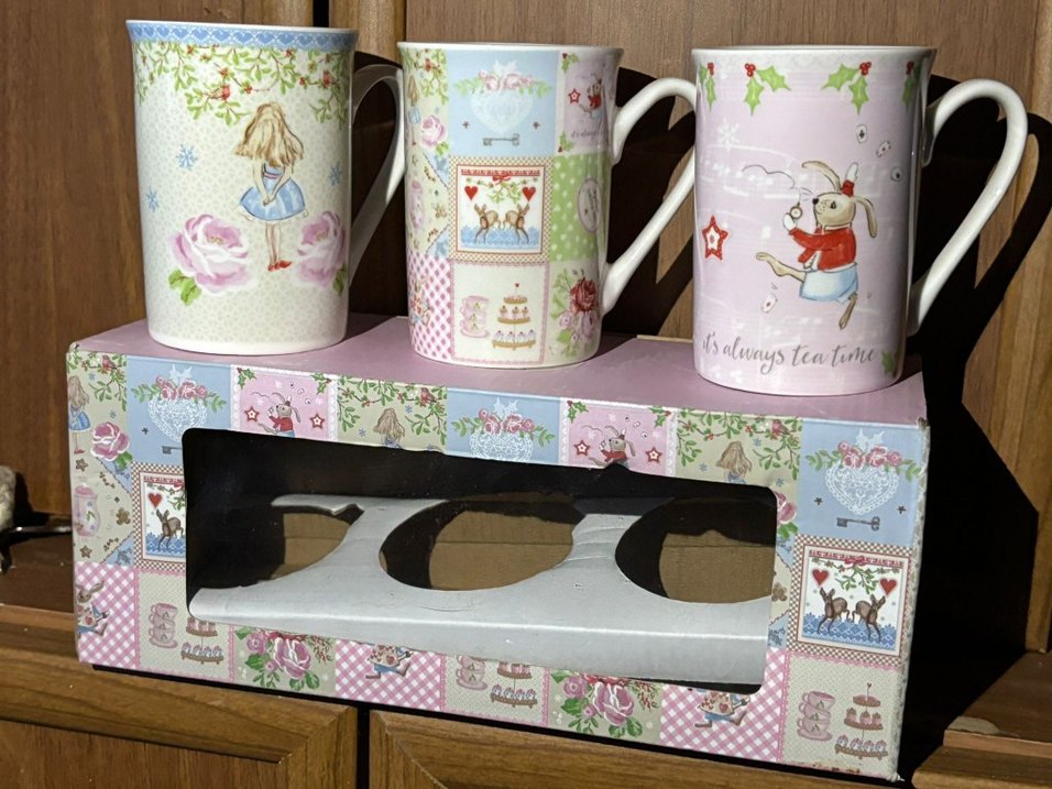 Pastel pembe renkli, zarif desenlere sahip kupalar ve çiçek temalı kutu. Yumuşak renkler ve sanatsal tasarımlar içerir. ☕