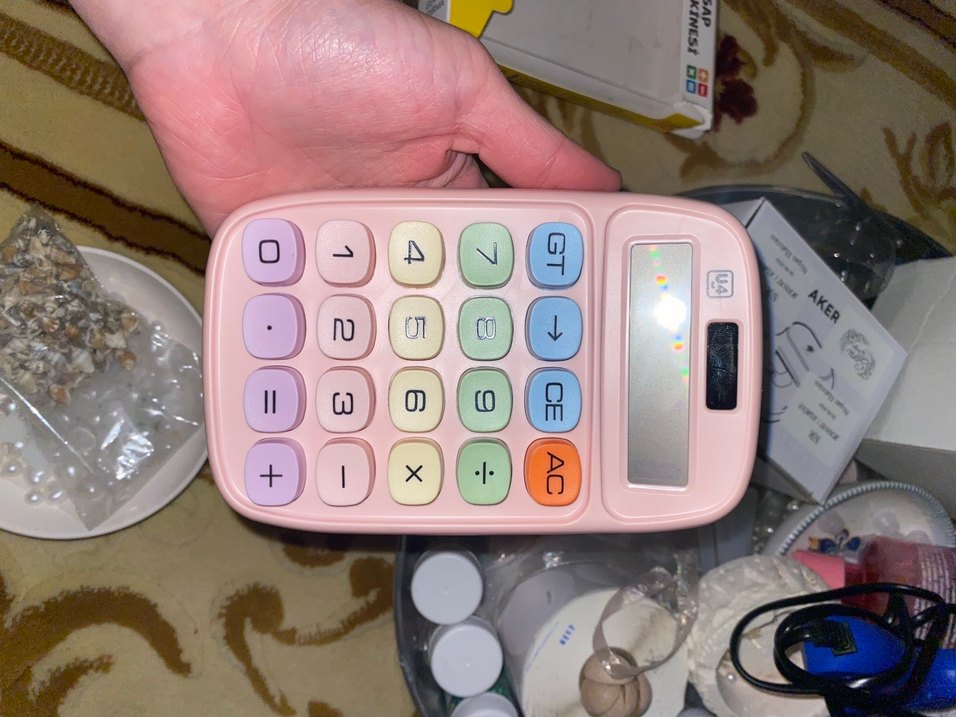 Pastel pembe renkte, CE, AC ve GT fonksiyonlu renkli tuşlara sahip hesap makinesi. Net ekranlı ve kompakt tasarımda.