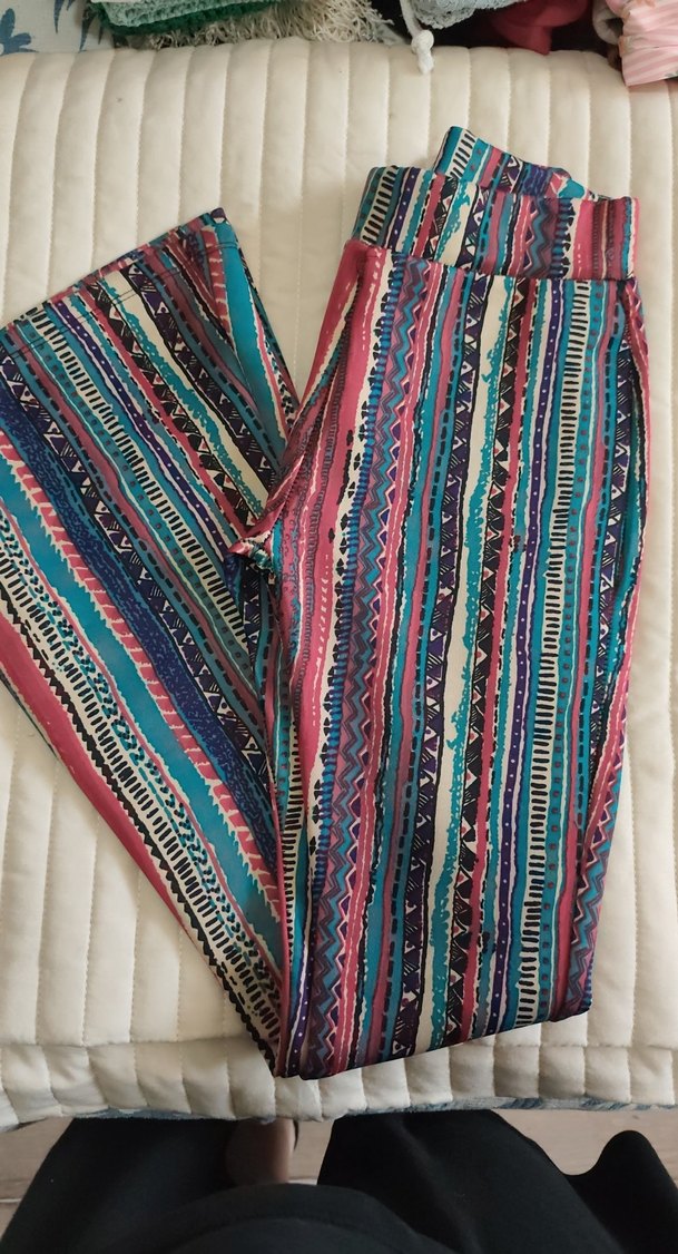 Uzun paça, bol kesim ve İspanyol paça tasarıma sahip, pastel renkli çoklu desenli bohem kadın kumaş pantolon.