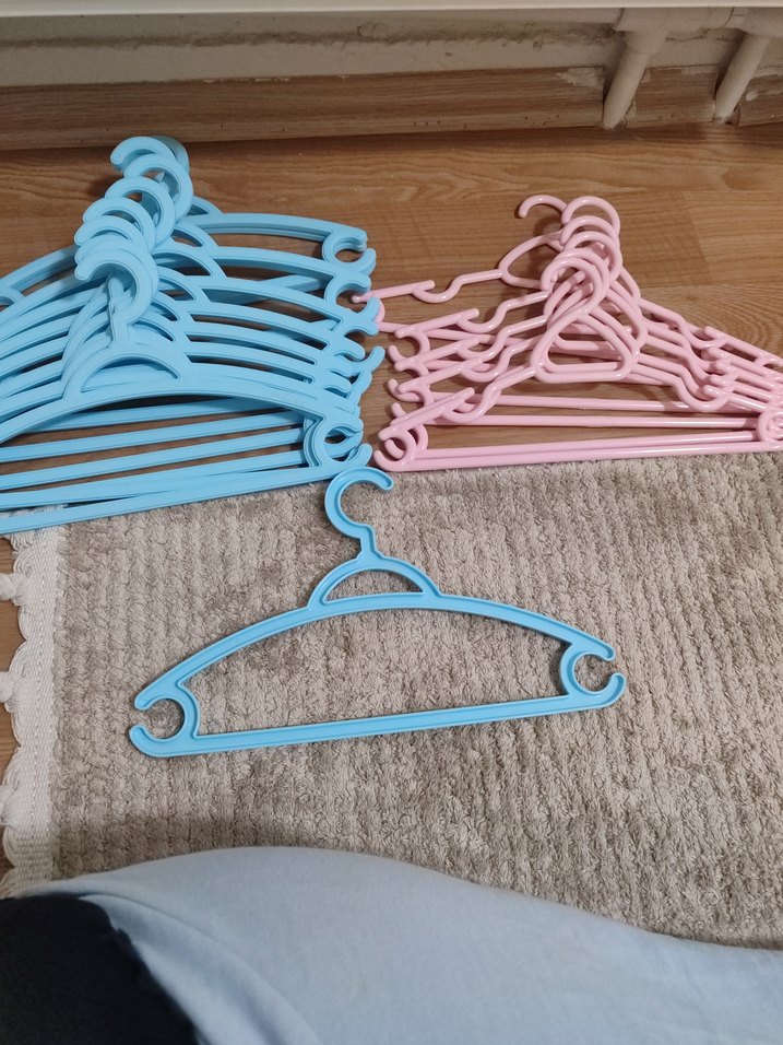 Pastel mavi ve pembe renkte plastik bebek askılar seti. Hafif ve dayanıklı yapısıyla çeşitli kıyafetler için uygundur.