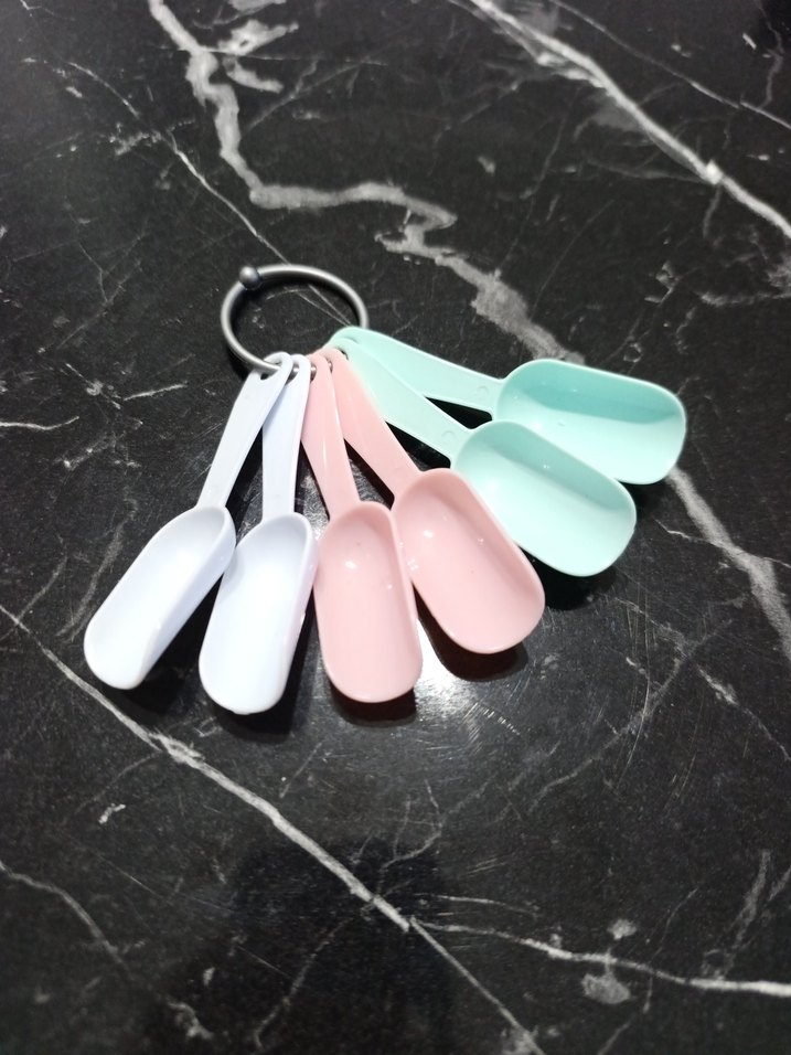 Pastel renklerde, farklı boyutlarda plastik ölçü kaşıkları seti. Kolay saklama için halka ile bağlıdır.