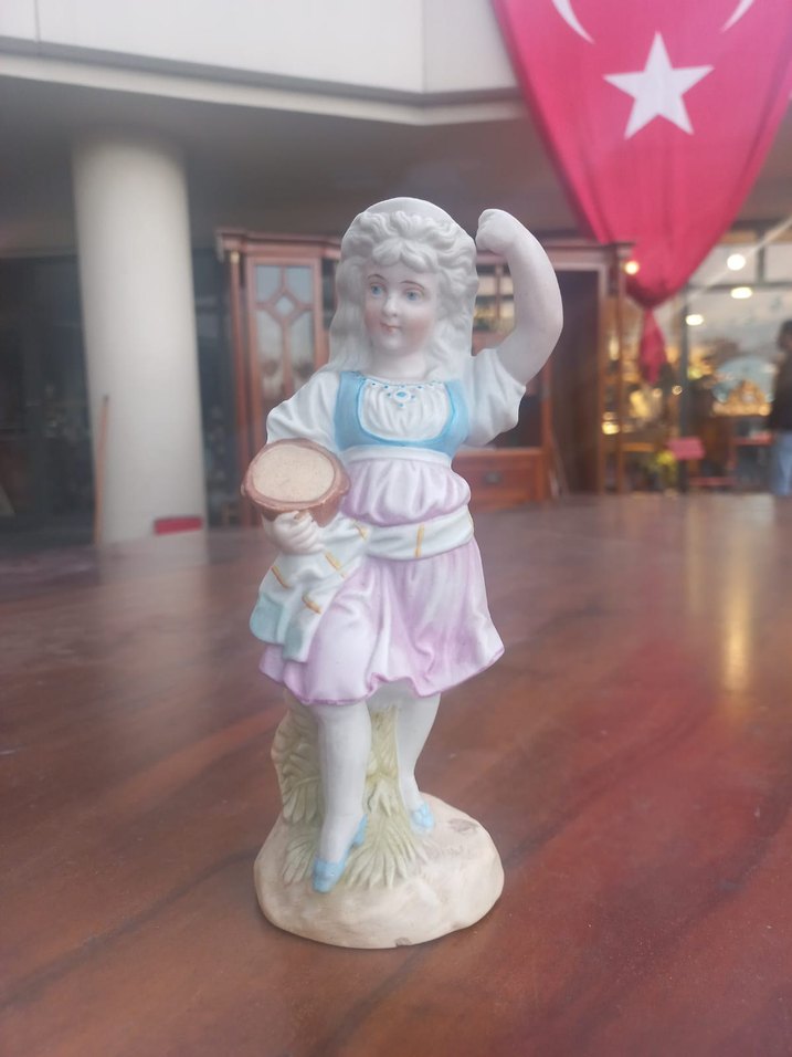 Pastel renklerde giysiler giymiş, tef tutan kız figürini. Dokulu bir taban üzerinde duruyor.