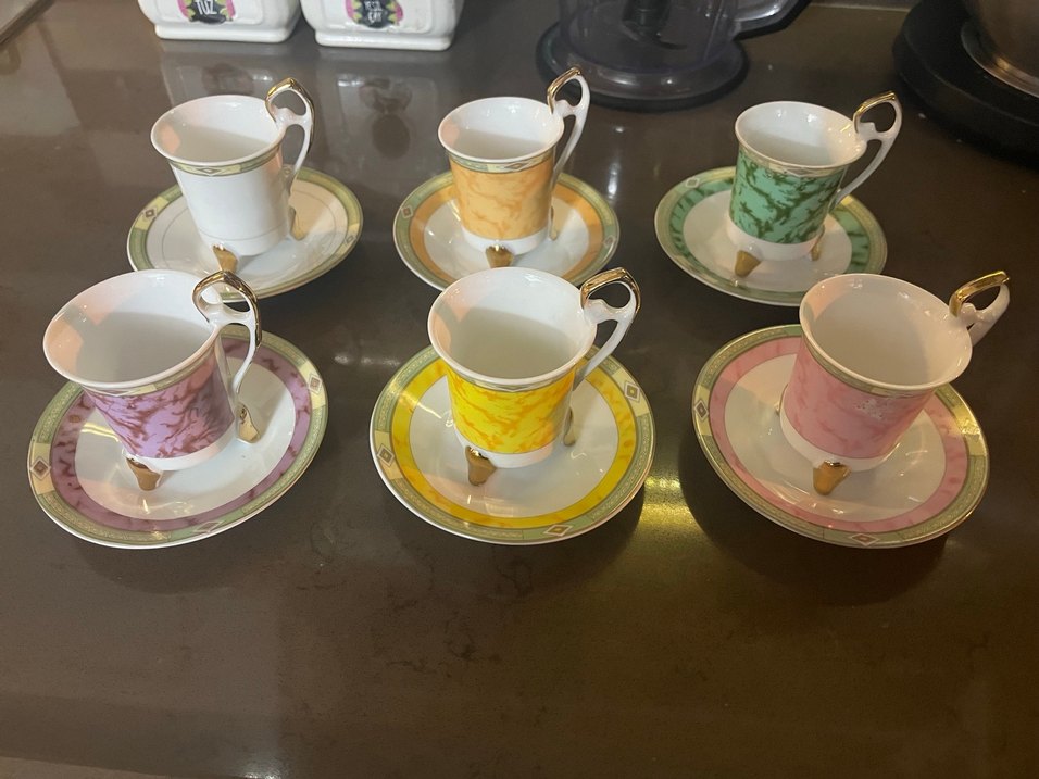 Pastel renklerde, altın detaylı kulplu porselen fincan ve tabak takımı. Sıcak içecekler için şık bir seçim. ☕