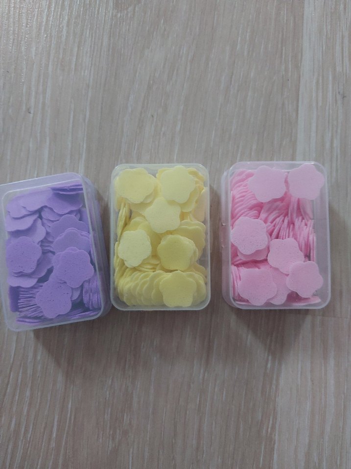 Mor, sarı ve pembe pastel renklerde, şeffaf kutularda saklanan #sabun#sihirlisabun#kagitsabun