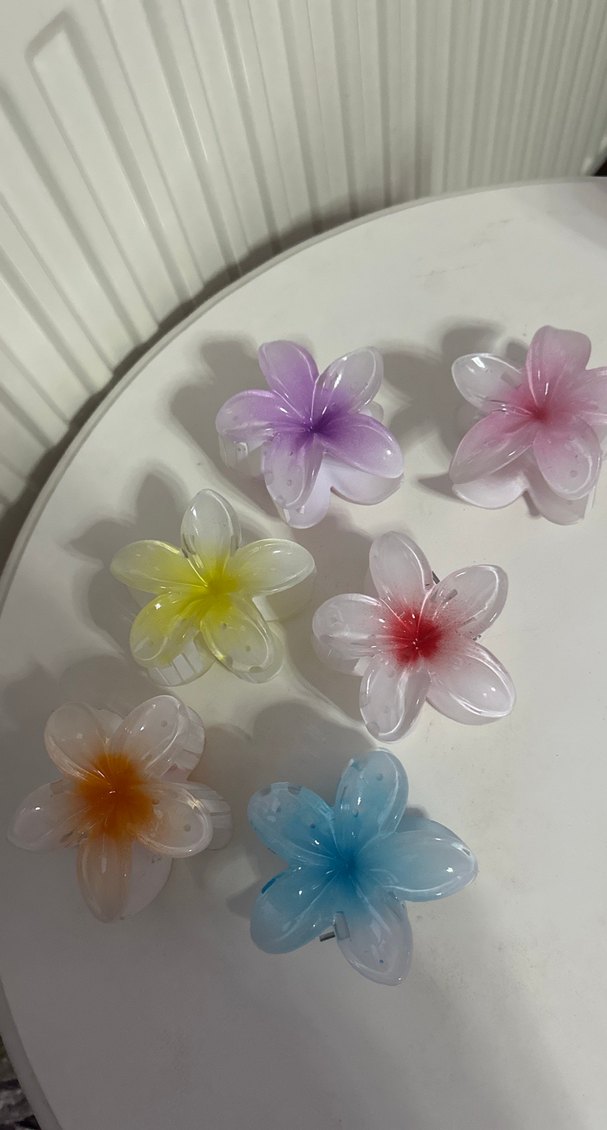 Şeffaf plastikten yapılmış, pastel mor, pembe, sarı, kırmızı, turuncu ve mavi renkli çiçek şeklinde saç tokaları. 6 adet lotus toka renkli
