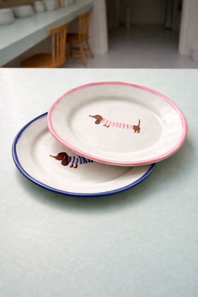 Pastel pembe ve mavi kenarlı seramik tabaklar, ortasında sevimli bir sosis köpek illüstrasyonu bulunur. Yemek sunumu için ideal. Sevgililer günü hediyesi olarak kullanılabilir