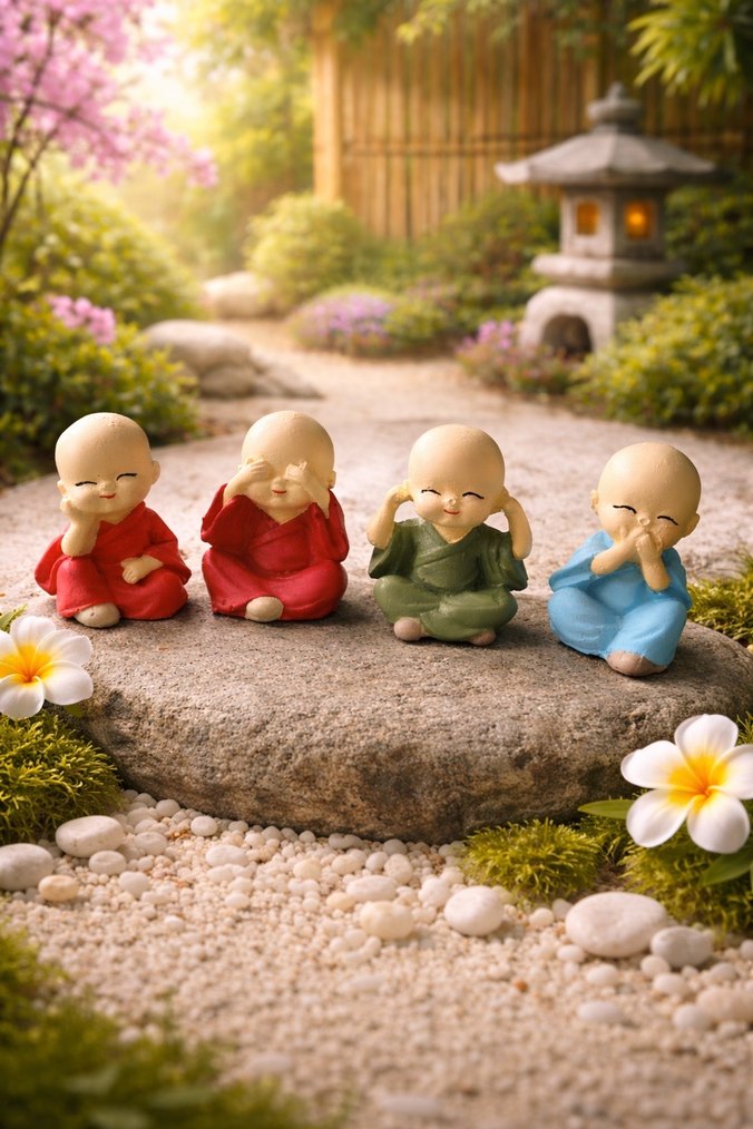 Dört farklı renkli elbise giymiş, neşeli ifadeli pastel renkli sevimli Buda görmedim, duymadım,bilmiyorum ve düşünüyorum seti. Dekoratif kullanım için uygundur.
