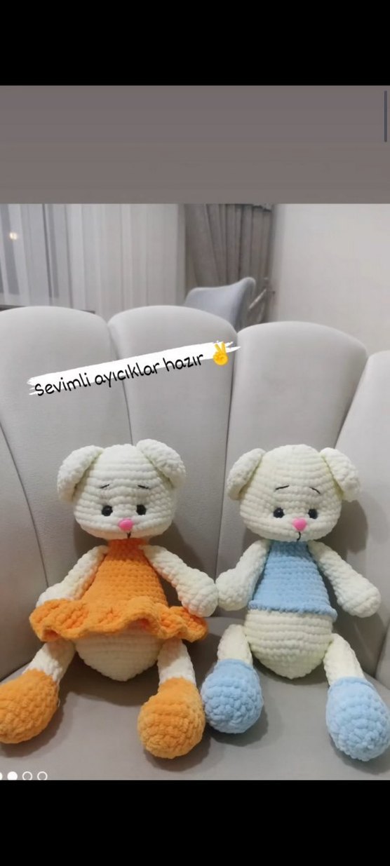 Turuncu elbiseli ve mavi kıyafetli, beyaz renkli iki yumuşak peluş ayıcık. Sevimli yüz ifadeleri var.