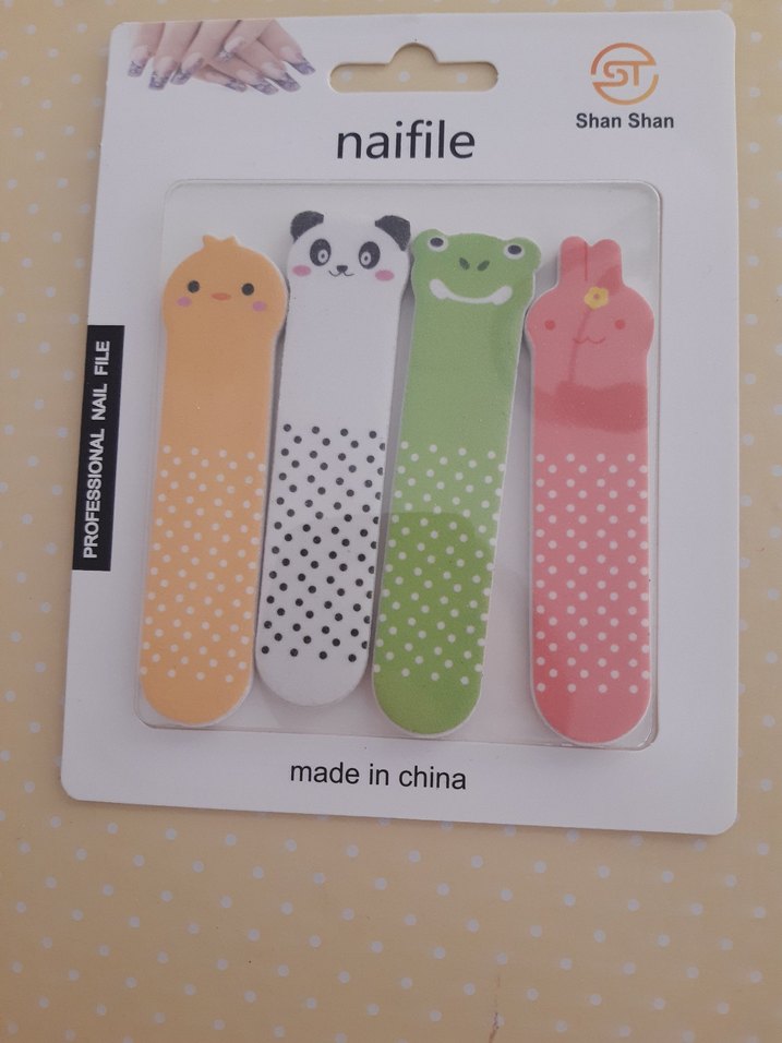 Dört pastel renkte, sevimli hayvan figürlü tırnak törpüsü seti. Yumuşak dokulu ve noktalı desene sahip. Ürün hiç kullanılmamıştır