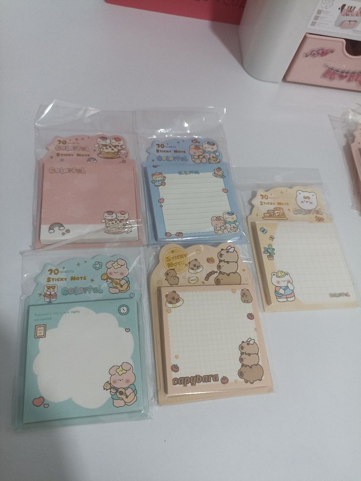 Pastel bej ve yumuşak renklerde, sevimli çizgi karakterlerle süslenmiş yapışkan not defterleri, hızlı notlar için uygun.