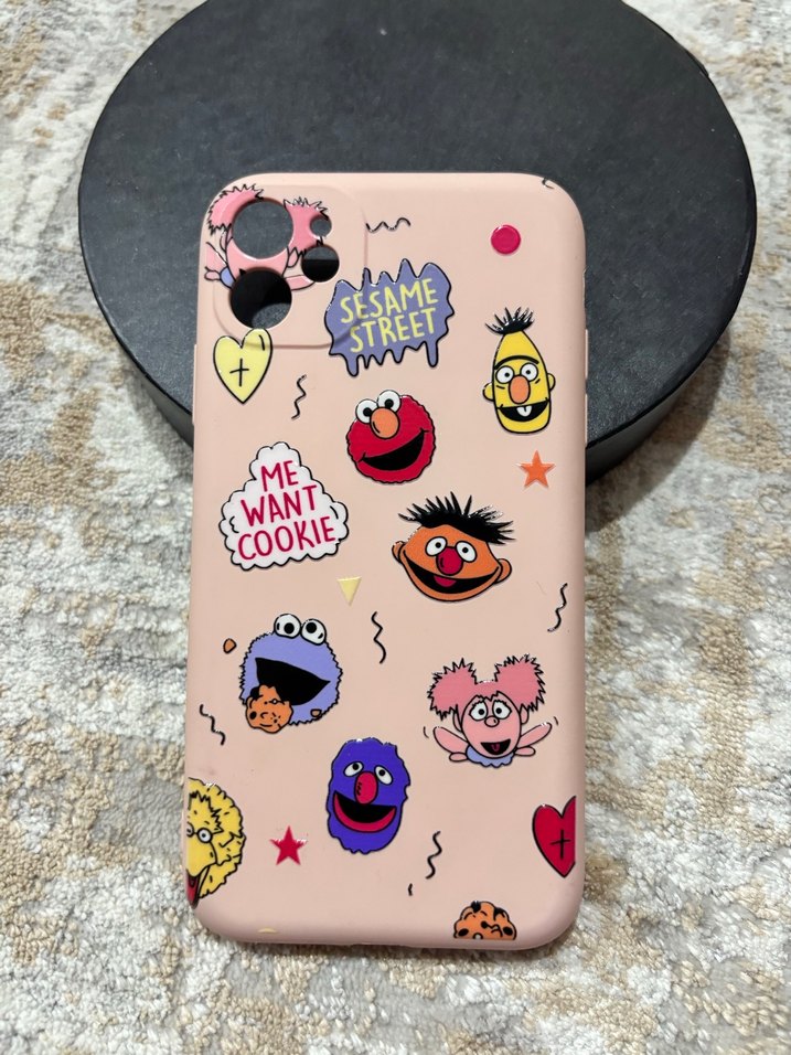 Pastel renklerde, şişkin tasarımlı Sesame Street karakterleri ve "COOKIE" yazısı içeren telefon kılıfı.