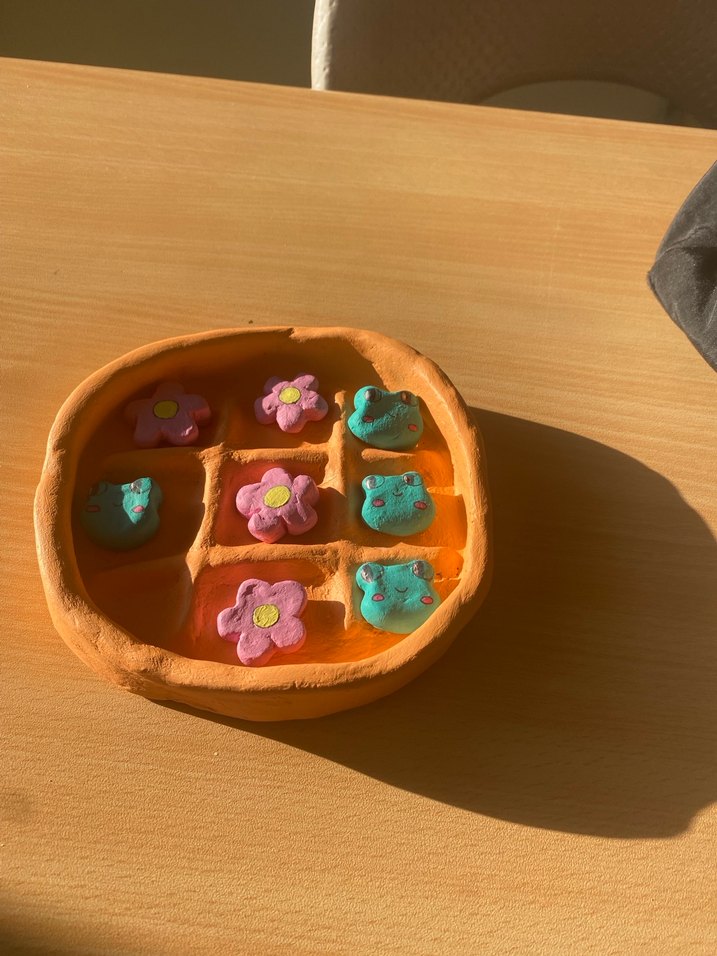 Pastel renklerde, el yapımı çiçek ve kurbağa figürlü sermaikle yapılmış sos oyunu.