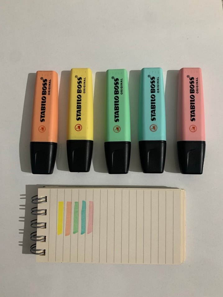 Beş pastel renkte Stabilo Boss fosforlu kalem seti; şeftali, sarı, yeşil, mavi ve pembe. Çok yönlü vurgulama için kesik uçludur.sari ve pembeyi bir iki kere denedim o kdr digerleri yepyeni hediye geldi kullanmiyorum.
