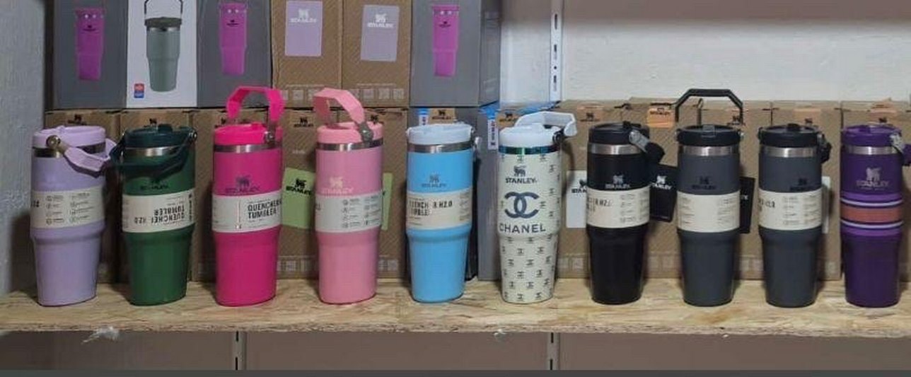 Pastel renklerde, Stanley ve Chanel marka, kapaklı ve ölçü işaretli termos bardaklar seti. Sıcak veya soğuk içecekler için uygundur.