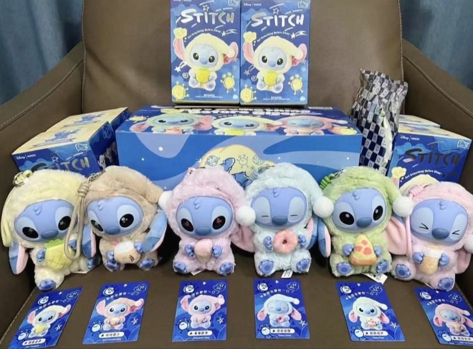 Pastel renklerde, farklı sevimli kıyafetlerde Stitch karakterleri peluş oyuncak seti. Yumuşak dokulu ve detaylı tasarımlı oyuncaklar.