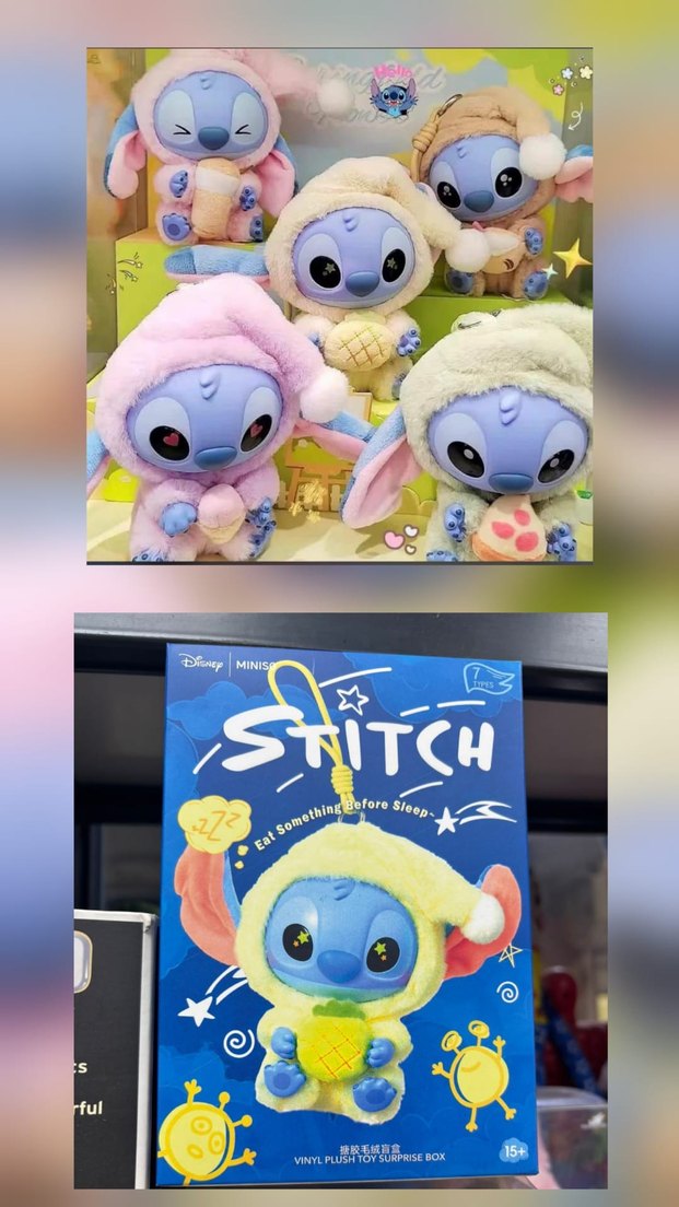 Yumuşak pastel renklerde, çeşitli rahat giysiler giymiş Stitch peluş oyuncaklar. Her biri uykulu ve sevimli ifadeye sahip.