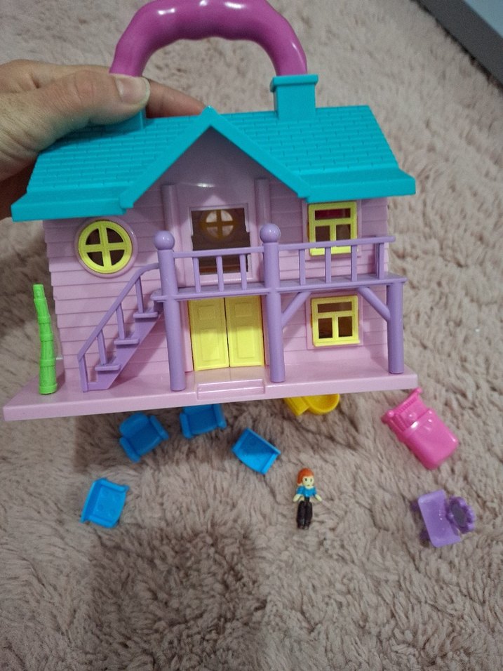 Pastel renklerde taşınabilir oyuncak ev, küçük mobilyalar ve figürle birlikte gelir. Hayal gücünü destekler. sorunsuz