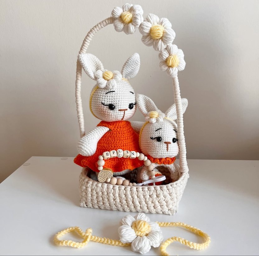 Pastel renkli, sepet içinde çiçek süslemeli, iki tığ işi tavşan diş kaşıyıcı ve çıngırak seti. Bebeklerin diş çıkarma döneminde rahatlamasına yardımcı olur.