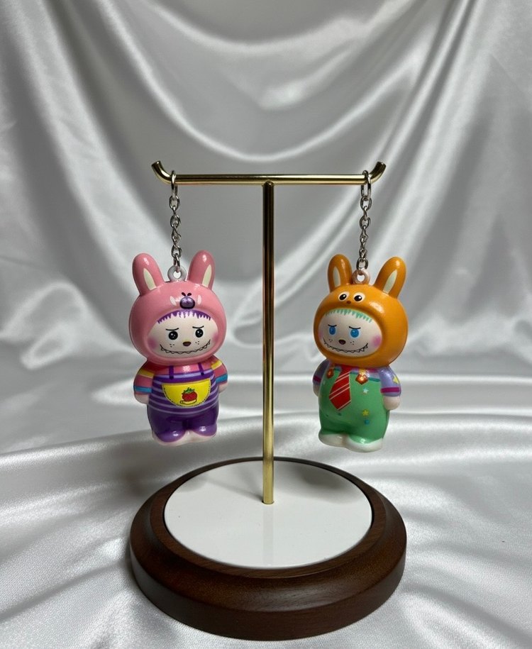 Pastel renklerde, tavşan figürlü iki anahtarlık seti. Her biri farklı yüz ifadeleri ve renkli kıyafetlere sahip.
