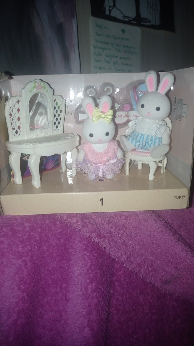 Pastel renklerde beyaz mobilya ve kumaş kıyafetli iki tavşan figüründen oluşan çocuk oyun seti