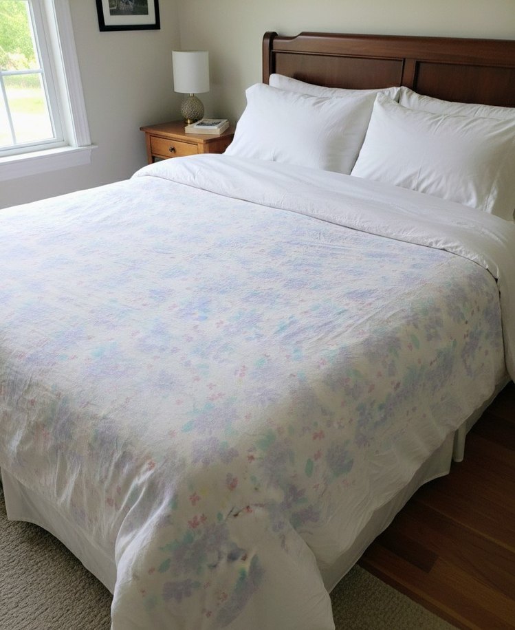 Beyaz zemin üzerinde pastel renkli tie-dye desenine sahip yorgan yüzü yatak odanıza yumuşak ve huzurlu bir görünüm katar. 150 x 210 cm