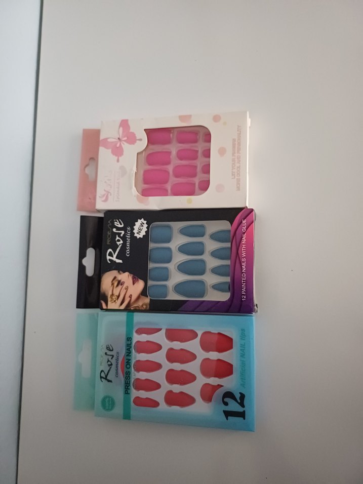 Farklı boylarda pastel tonlarda pembe, mavi ve mercan renkli takma tırnak seti.