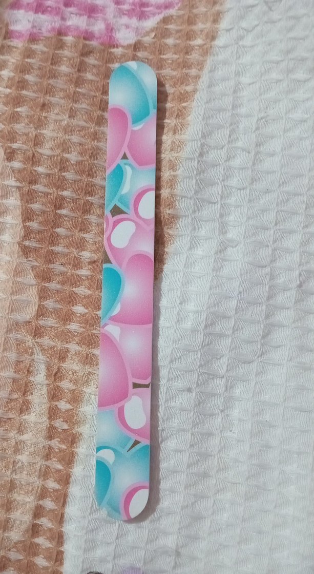 Pastel renklerde, mavi ve pembe tonlarda desenli tırnak törpüsü.