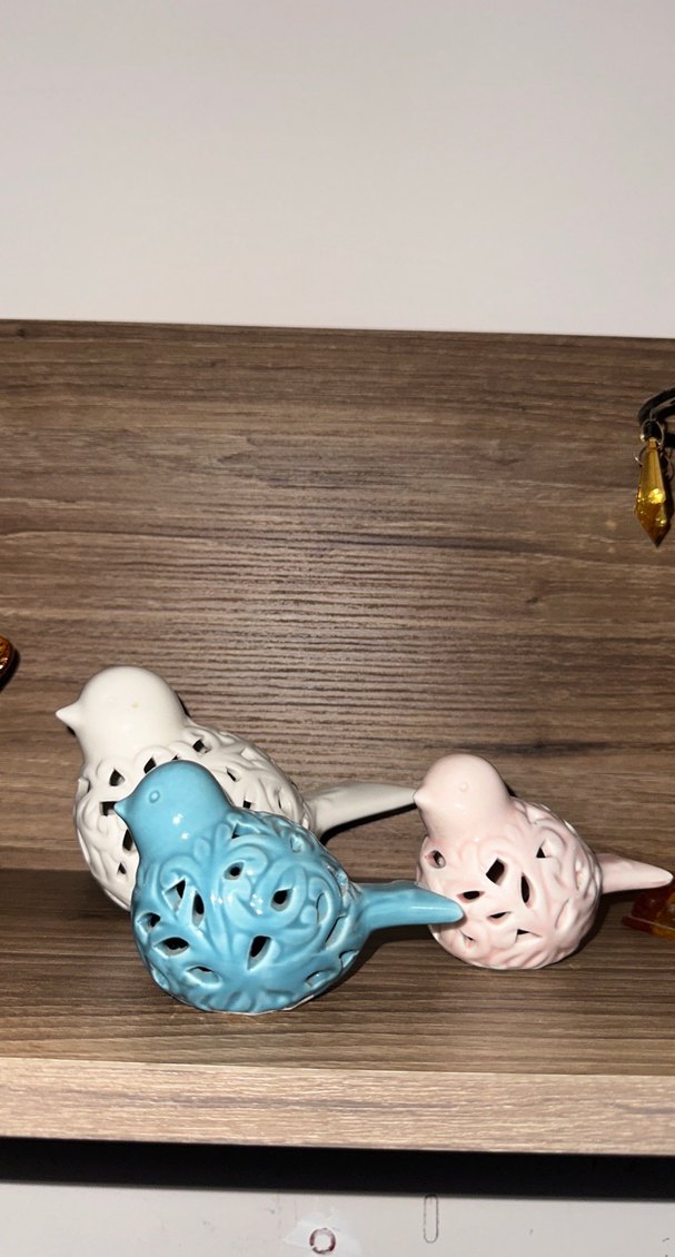 Pastel turkuaz renkli seramik kuş biblosu, zarif oyma desenlere sahip. Yanında yumuşak pastel tonlarda iki adet daha biblo bulunur.