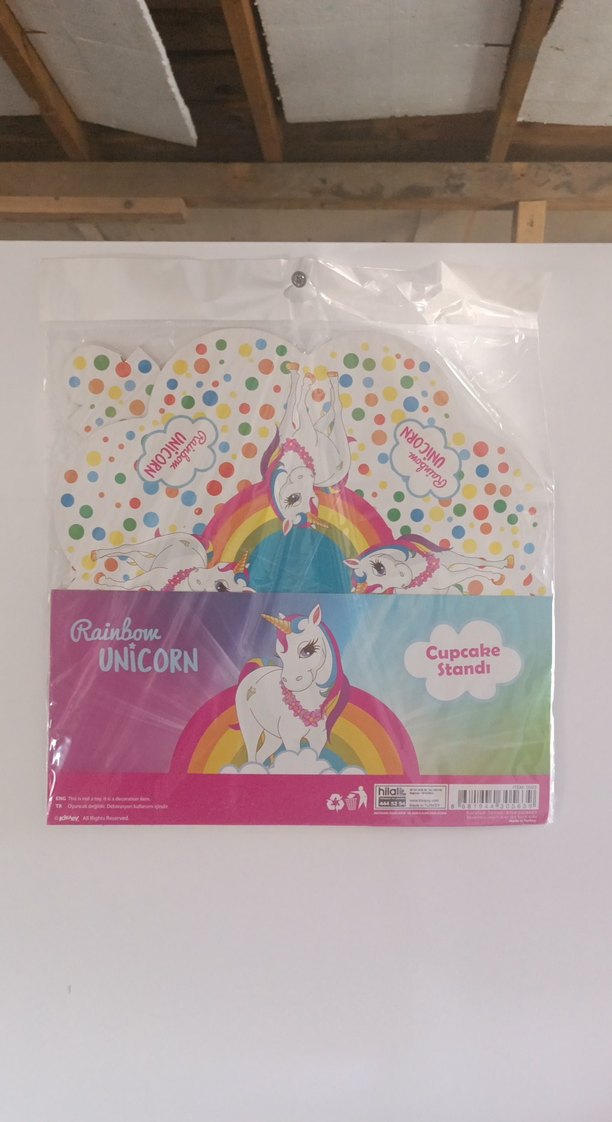 Unicorn ve gökkuşağı desenli, pastel renklerde çok renkli noktalar içeren cupcake standı. Parti süslemeleri için uygundur.