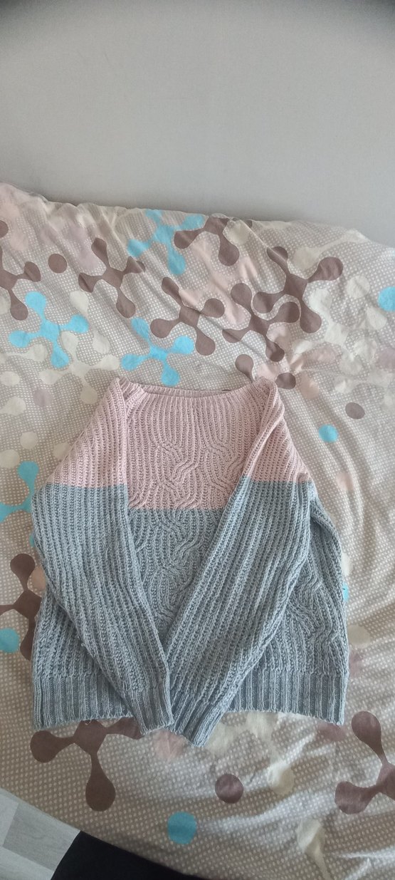 Pastel renklerde, uzun kollu, bol kesim ve örgü detaylı kazak, rahat bir kullanım sunar. bir kere giydim marka öne çıkması için.