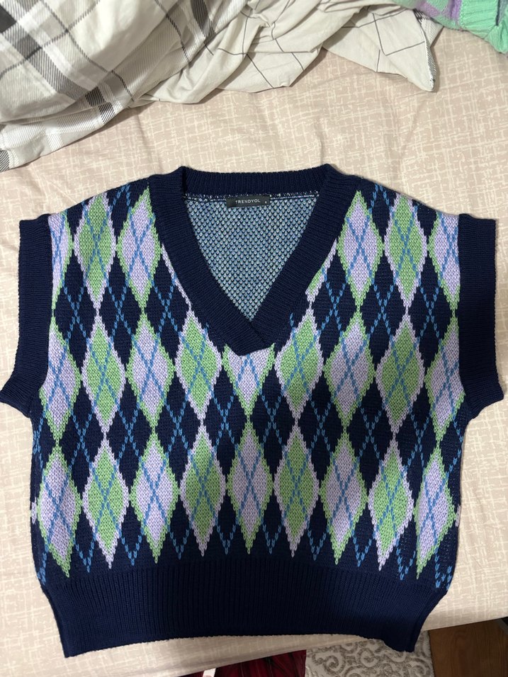 V yaka, pastel çok renkli argyle desenli, örgü kumaştan, rahat kesim kolsuz süveter. Günlük rahat sokak stili için uygundur.
