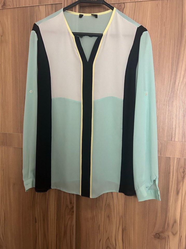 Uzun kollu, V yakalı ve midi boyda kadın gömlek. Sentetik kumaştan üretilmiş, düğmeli ve çok renkli pastel tonlarda, ofis kullanımı için uygun.