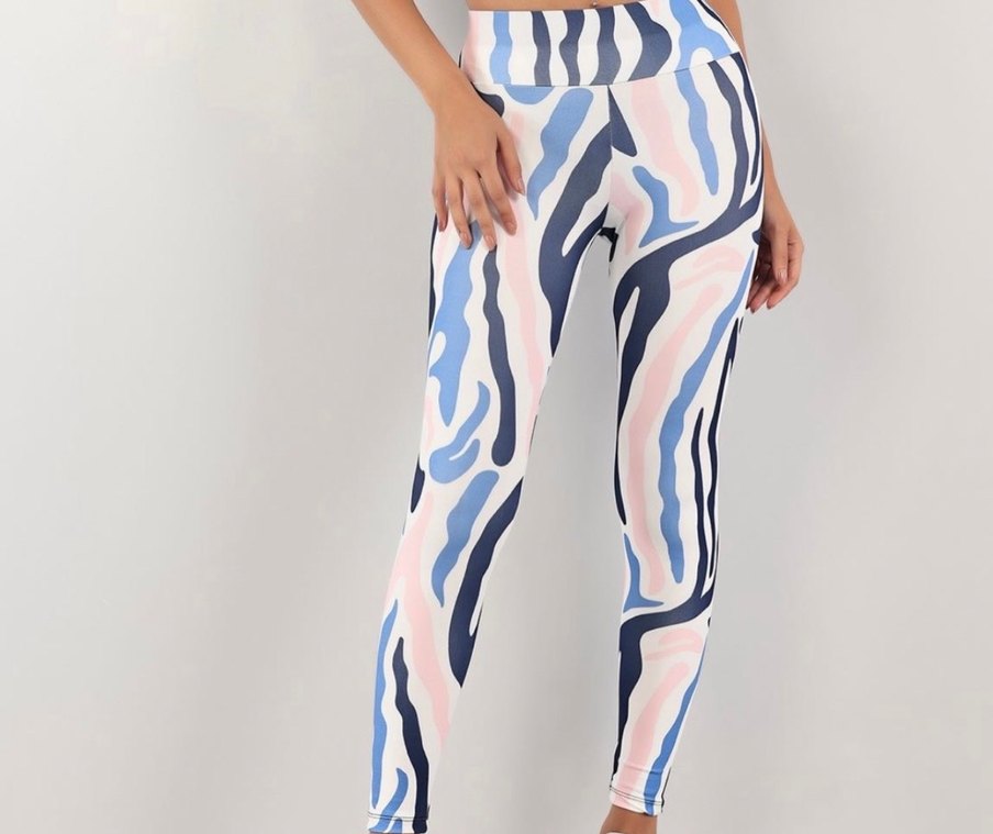 Pastel renklerde zebra desenli, elastik bel bantlı, sentetik kumaştan yapılmış uzun ve dar kesim kadın tayt.