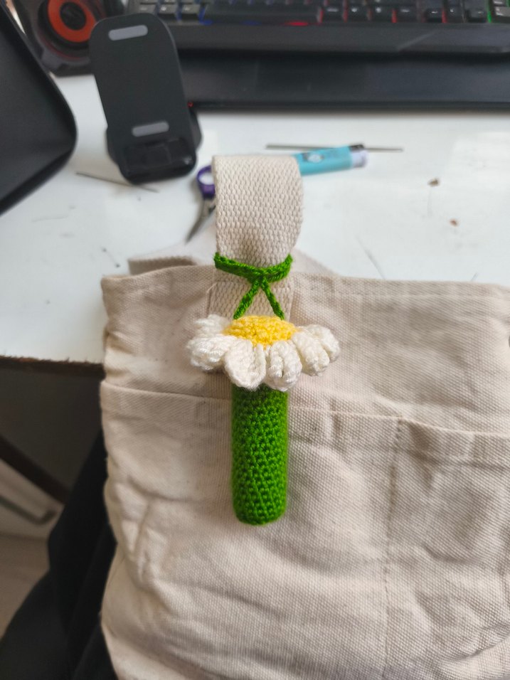 Yumuşak beyaz ve yeşil renkli, çiçek şeklinde örülmüş pastel tonlarda ruj taşıma charmı mantarlısı da mevcut